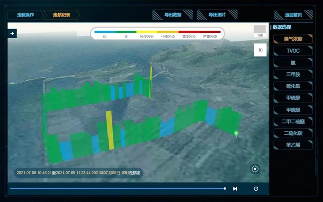 此次走航期間,僅發(fā)現(xiàn)2處臭氣濃度監(jiān)測(cè)數(shù)值相對(duì)較高的區(qū)域。第一個(gè)高值區(qū)域?yàn)槟承虏牧瞎径趶S區(qū),走航車(chē)經(jīng)過(guò)該區(qū)域時(shí),走航地圖顯示臭氣濃度以黃色柱形圖顯示,屬輕度污染,結(jié)合導(dǎo)出的走航數(shù)據(jù)發(fā)現(xiàn),該區(qū)域的臭氣濃度監(jiān)測(cè)因子最高值達(dá)到13(OU),雖未超標(biāo),但略高于其他區(qū)域監(jiān)測(cè)數(shù)值;第二個(gè)高值區(qū)域?yàn)槟硽怏w生產(chǎn)單位廠區(qū)附近,現(xiàn)場(chǎng)人員經(jīng)過(guò)該區(qū)域時(shí)能夠聞到空氣中的臭味,因此在該區(qū)域進(jìn)行了短暫的停留,后結(jié)合導(dǎo)出的走航地圖及走航數(shù)據(jù)發(fā)現(xiàn),該區(qū)域的臭氣濃度監(jiān)測(cè)因子數(shù)值最高達(dá)到19(OU),也未超過(guò)國(guó)家二級(jí)標(biāo)準(zhǔn)規(guī)定的20(OU)濃度要求。綜合分析,本次走航監(jiān)測(cè)區(qū)域整體空氣質(zhì)量較為優(yōu)良,無(wú)長(zhǎng)時(shí)間、氣味明顯的惡臭污染,但應(yīng)該針對(duì)某新材料公司和某氣體生產(chǎn)企業(yè)進(jìn)行重點(diǎn)監(jiān)控。本次走航監(jiān)測(cè),為當(dāng)?shù)丨h(huán)境部門(mén)進(jìn)行重點(diǎn)區(qū)域惡臭污染排查提供了可靠的數(shù)據(jù)支撐,對(duì)于敦促企業(yè)進(jìn)行整改、確保該市環(huán)境空氣質(zhì)量維持優(yōu)良水平貢獻(xiàn)出了一份力量。