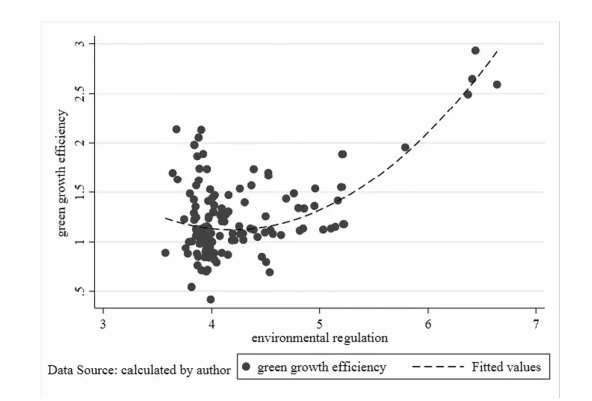 最后,文章進(jìn)一步討論了環(huán)境規(guī)制對(duì)不同污染排放強(qiáng)度的行業(yè)的影響。回歸結(jié)果顯示環(huán)境規(guī)制對(duì)中高污染行業(yè)具有顯著的“U”型曲線效應(yīng)。并且根據(jù)數(shù)值計(jì)算,當(dāng)曲線達(dá)到最小值時(shí),對(duì)于高污染和中等污染行業(yè),對(duì)應(yīng)的環(huán)境規(guī)制數(shù)值分別為3.92和4.54。而七個(gè)高污染行業(yè)中,多數(shù)行業(yè)的環(huán)境規(guī)制數(shù)值均超過(guò)3.92,表明環(huán)境規(guī)制對(duì)高污染行業(yè)的綠色增長(zhǎng)具有正向影響。相比之下,七個(gè)中污染行業(yè)的環(huán)境監(jiān)管強(qiáng)度未超過(guò)4.54,表明環(huán)境規(guī)制對(duì)這些行業(yè)綠色增長(zhǎng)的影響仍然是負(fù)面的。可能原因是中污染行業(yè)還不是環(huán)境政策所重點(diǎn)監(jiān)管的對(duì)象。