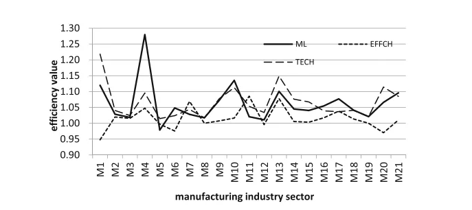 圖1展示了制造業(yè)的總體ML指數(shù)分布趨勢(shì)。根據(jù)分解結(jié)果可以看出,技術(shù)進(jìn)步是推動(dòng)增長(zhǎng)的主要因素。具體行業(yè)中,煙草制造業(yè)(M4)的指數(shù)值最高,其次是“環(huán)境友好型”行業(yè),如藥品制造業(yè)(M10)和測(cè)量?jī)x器業(yè)(M21)。從投入產(chǎn)出的角度來(lái)看,這些部門(mén)的特點(diǎn)是投入低且非期望產(chǎn)出少。在指數(shù)值最低的三個(gè)行業(yè)部門(mén)中,主要是污染物排放較嚴(yán)重的行業(yè)。例如,排放大量工業(yè)廢水的紡織品制造行業(yè)(M5)、產(chǎn)生高廢氣排放的石油加工、焦化和核燃料加工行業(yè)(M8)以及產(chǎn)生大量工業(yè)固體廢物的非金屬礦物行業(yè)(M12)。
