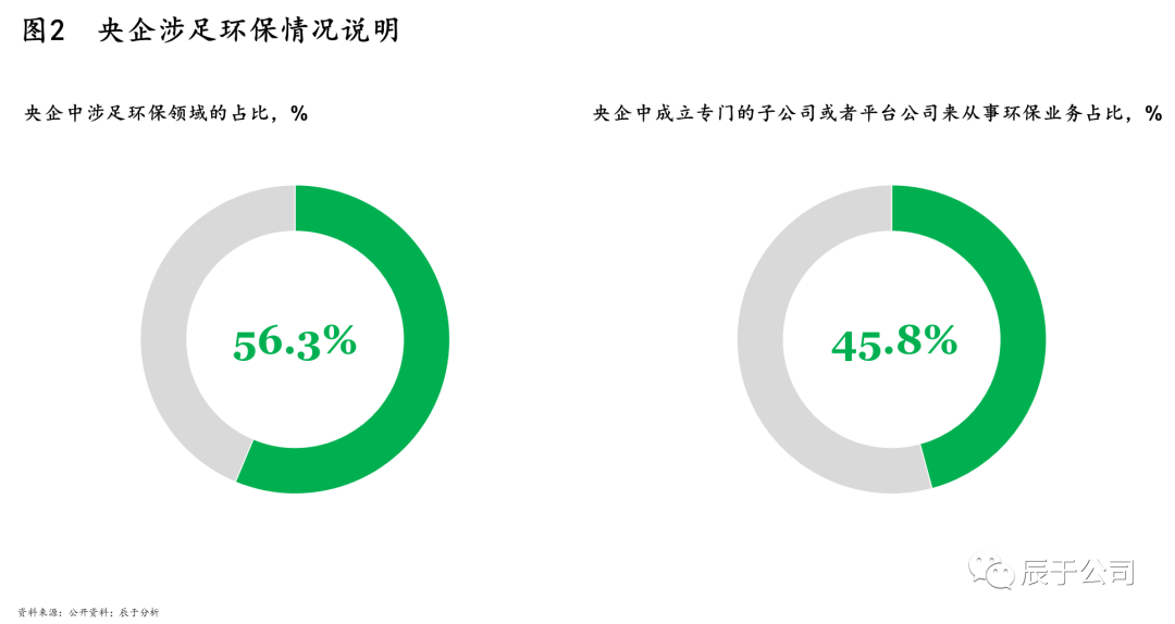 央企在關(guān)系到國(guó)民經(jīng)濟(jì)命脈的主要行業(yè)和關(guān)鍵領(lǐng)域占據(jù)支配地位,而生態(tài)環(huán)保是國(guó)家的千年大計(jì),不少央企正把目光瞄準(zhǔn)生態(tài)環(huán)保領(lǐng)域,將生態(tài)環(huán)保作為未來(lái)發(fā)展的新賽道。據(jù)初步統(tǒng)計(jì),在96家央企中,有超過(guò)四成都專門成立了從事生態(tài)環(huán)保業(yè)務(wù)或開(kāi)創(chuàng)生態(tài)環(huán)保業(yè)務(wù)的子公司、平臺(tái)(見(jiàn)圖2),例如中交集團(tuán)下屬中國(guó)城鄉(xiāng)控股集團(tuán)有限公司,中國(guó)鐵建下屬中鐵建發(fā)展集團(tuán)有限公司等,他們對(duì)生態(tài)環(huán)保的重視可見(jiàn)一斑。