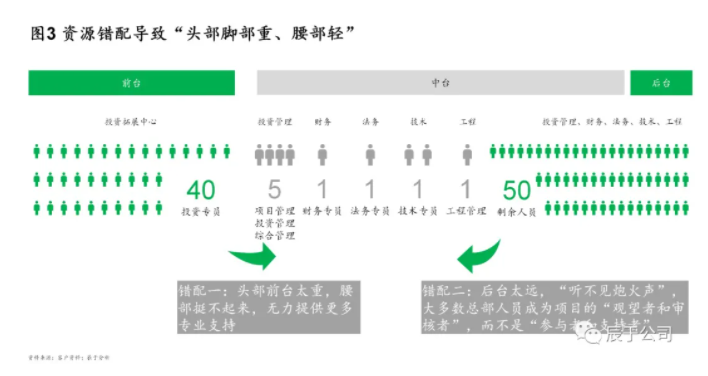 不難發(fā)現(xiàn),近年來一些企業(yè)開始“招兵買馬”,大量招聘投資拓展人員,這對于企業(yè)提高投資拓展能力自然是好事。不過我們也注意到,一些企業(yè)在投資相關(guān)的人員配置上卻不盡合理:他們通常把大量投資拓展人員“撒在前線”,同時建立“大后臺”,與投資相關(guān)的投管、財務(wù)、法務(wù),甚至技術(shù)、工程、運營等人員主要負責項目質(zhì)量把關(guān)和風險管控,只有少量人員在中臺為前臺提供“彈藥”和支持(見圖3)。這種“頭重腳重”帶來兩個“錯配”,一是頭部前臺太重,腰部挺不起來,無力提供更多專業(yè)支持;二是腳部后臺太遠,“聽不見炮火聲”,大多數(shù)人成為項目的“觀望者和審核者”,而不是“參與者和支持者”。