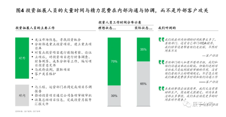 理想狀態(tài)下,對外對內(nèi)工作的時間分配比例應(yīng)該是7:3,甚至更高也不為過,但現(xiàn)實往往相反,由于內(nèi)部協(xié)同效率不高、流程繁冗、“人治”問題嚴重,我們發(fā)現(xiàn)一些投資拓展人員更多的時間與精力花費在內(nèi)部溝通與協(xié)調(diào),而不是外部客戶攻關(guān)(見圖4)。造成這種現(xiàn)象的原因,表面看上去是內(nèi)部流程繁瑣,決策鏈條冗長,實則是內(nèi)部沒有形成一以貫之以市場為導向、以項目為核心的理念文化。平時大多只是喊喊口號而已,并未真正付諸行動。