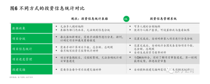 此外,我國生態(tài)環(huán)保產(chǎn)業(yè)數(shù)字化滲透率尚處于較低水平,即使是頭部企業(yè),也僅是在財務(wù)、行政、人力資源、工程等條線進行了IT系統(tǒng)建設(shè),投資管理的IT系統(tǒng)建設(shè)很少,更別提利用大數(shù)據(jù)、機器學習、人工智能等先進技術(shù)為投資決策提供支持了,不管是數(shù)據(jù)收集、還是項目分級、信息統(tǒng)計、進度管理、投建交接等工作,基本依靠手動操作,效率低下且容易出錯(見圖6)。