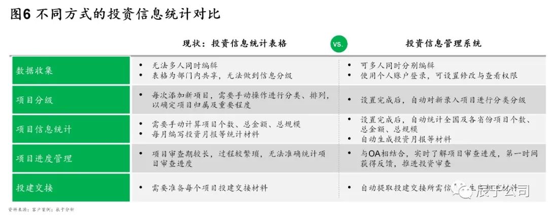 此外,我國生態(tài)環(huán)保產(chǎn)業(yè)數(shù)字化滲透率尚處于較低水平,即使是頭部企業(yè),也僅是在財務(wù)、行政、人力資源、工程等條線進(jìn)行了IT系統(tǒng)建設(shè),投資管理的IT系統(tǒng)建設(shè)很少,更別提利用大數(shù)據(jù)、機(jī)器學(xué)習(xí)、人工智能等先進(jìn)技術(shù)為投資決策提供支持了,不管是數(shù)據(jù)收集、還是項目分級、信息統(tǒng)計、進(jìn)度管理、投建交接等工作,基本依靠手動操作,效率低下且容易出錯(見圖6)。