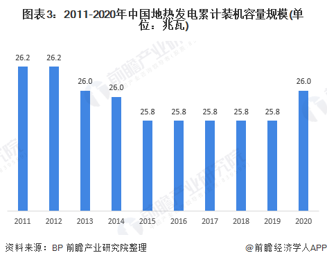 我國地?zé)崮荛_發(fā)利用處于起步階段有關(guān),關(guān)鍵技術(shù)有待突破。根據(jù)英國石油公司BP的數(shù)據(jù)顯示,2011-2019年,中國地?zé)岚l(fā)電累計(jì)裝機(jī)容量一直在25-27兆瓦區(qū)間內(nèi),近五年更是沒有出現(xiàn)過變動。隨著我國“碳中和”和“碳達(dá)峰”目標(biāo)的確立,中國地?zé)岚l(fā)電裝機(jī)容量得到增長。