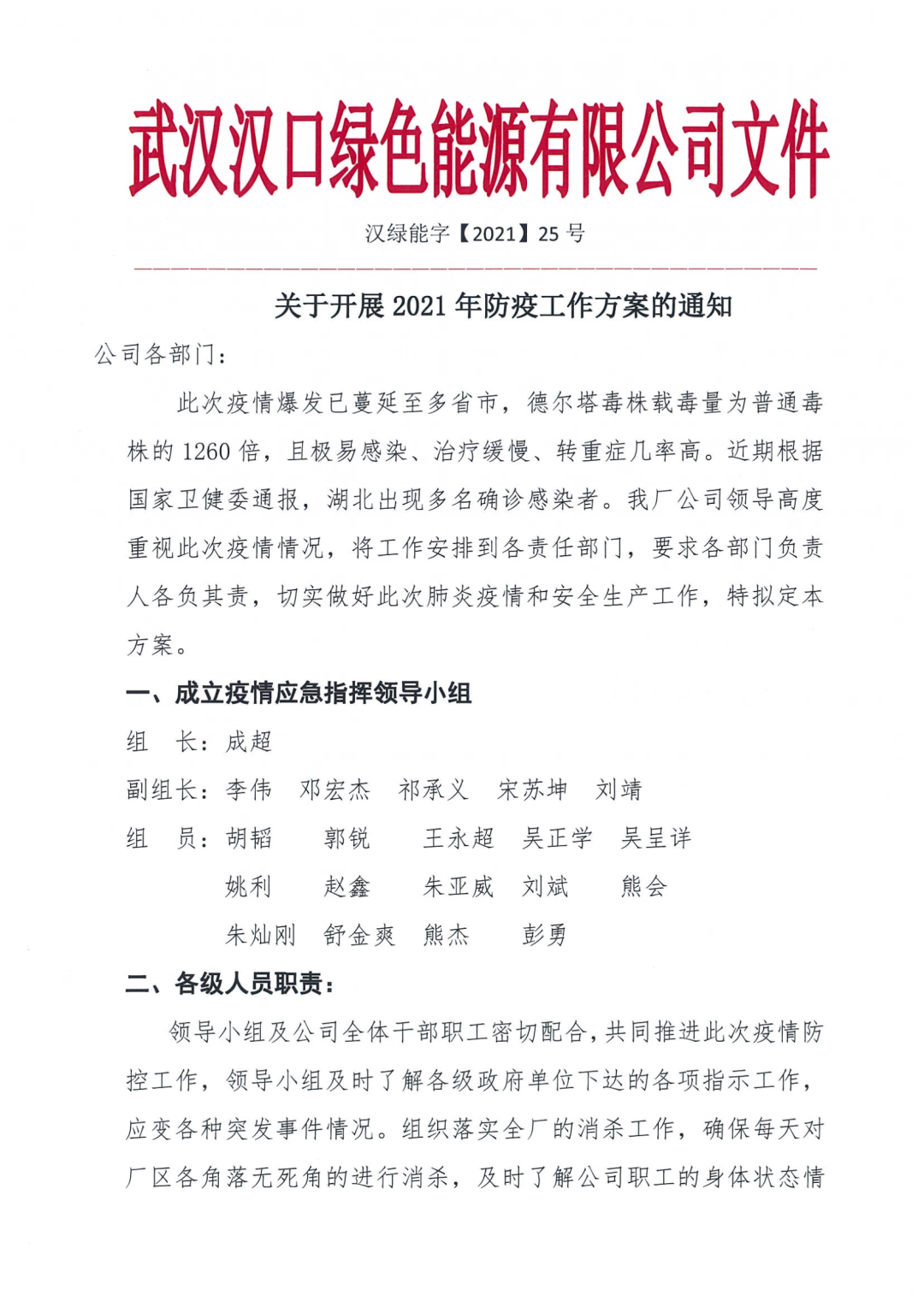 同日,漢口垃圾發(fā)電廠發(fā)布《關(guān)于開展2021年防疫工作方案的通知(漢綠能字【2021】25號)通知》,迅速成立電廠疫情應(yīng)急指揮小組,對各部門、各級人員疫情防控職責及防疫措施進行了明確。
