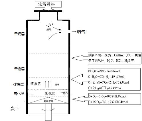 干燥后的垃圾逐漸降至熱解段,在控制的缺氧條件下有機(jī)物發(fā)生熱解,生成可燃?xì)怏w和灰渣。在熱分解段和氣化燃燒段分解成一氧化碳、氣態(tài)烴類等混合物進(jìn)入混合煙氣中。熱解氣化后的殘留物(液態(tài)焦油、較純的碳素及垃圾本身含有的無機(jī)灰土和惰性物質(zhì)) 進(jìn)入燃燒層充分燃燒。燃燒層沿高度方向可分為氧化區(qū)和還原區(qū)。