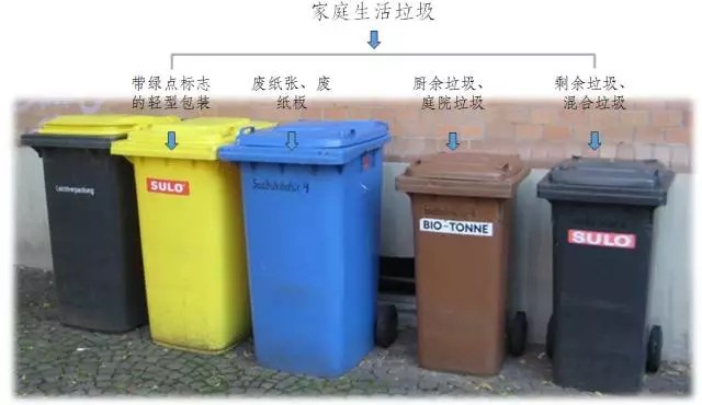 德國生活垃圾分類多采用“五分法”,即將生活垃圾分為以下五大類分別扔入不同顏色垃圾桶:棕色桶裝有機垃圾(包括剩飯剩菜、果皮骨頭等廚余垃圾,庭院綠化垃圾);黃色桶(或袋)裝輕型包裝(如塑料袋,包裝盒,牛奶盒等);藍色桶收集廢紙與廢紙箱;廢玻璃經(jīng)過分類后分別投入棕色、白色、綠色三種顏色的垃圾桶;剩余黑色或灰色的桶,用來收集所有居民分到無法再分的剩余垃圾。