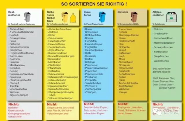 此外,居民需要把大件垃圾、有毒有害垃圾或電子廢棄物投放到專門的回收站內(nèi)。裝修垃圾需要預(yù)定一個大型垃圾箱,居民可以自己送到垃圾處理中心,但一般由于過重過大會叫上門收取服務(wù),垃圾按重量計算。舊衣物垃圾可以放進居民區(qū)附近的紅十字會設(shè)立的專門收取舊衣物的箱子。舊家具家電則可以放在家門口,讓需要的人拿走,也會有專門的人來收取舊家電。在德國,垃圾分類是每個公民的義務(wù),如果分類不到位,將受到高額罰款,且個人的社會信譽也會受到影響。為了讓居民熟悉垃圾的分類原則,很多城市都印發(fā)了專門的《垃圾分類說明》。在每年年初,政府都會將新的《垃圾分類說明》和《垃圾清運時間表》挨家挨戶投到各家郵箱,上邊有該家庭所屬的街道的名稱還有每周固定時間清理何種垃圾的信息,然后在指定日期前一天把某種固定的垃圾桶或垃圾袋放到街上等待收運。政府也采取了一系列措施來監(jiān)管公民的垃圾行為(這部分內(nèi)容來源于網(wǎng)絡(luò))。
