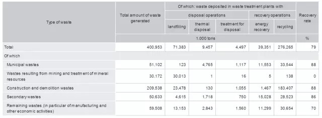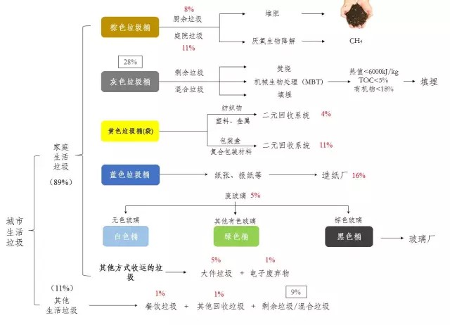 按照產(chǎn)生來源,德國的城市生活垃圾(MSW)主要分為家庭垃圾和其他垃圾兩大類。家庭垃圾包括普通家庭生活垃圾、公共垃圾、大件垃圾(廢舊家具、家電等)、有機垃圾、可回收利用的垃圾(玻璃、廢紙、紙板、塑料、輕質(zhì)包裝材料、金屬等);其他垃圾包括街道清掃垃圾、菜場垃圾、其他混合生活垃圾等。