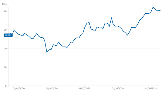 歐盟碳市場(chǎng)的穩(wěn)定結(jié)構(gòu)框架以及歐盟內(nèi)部長(zhǎng)期政策的合理性在2020年的運(yùn)行中得到較好體現(xiàn)。2020年是歐盟碳市場(chǎng)第三階段運(yùn)行的最后一年,也是第四交易階段的密集準(zhǔn)備階段,碳價(jià)格在3、4月有短期大幅下降,從年初最高29.68美元降至4月最低18.04美元,但5月后價(jià)格又逐漸回升,并在7月達(dá)到33.89美元,此后一直在30美元左右徘徊,最后在同年12月達(dá)到42.16美元。在未來(lái),歐盟《綠色新政》一攬子復(fù)蘇計(jì)劃以及《歐盟氣候法》中包含的2030年的新目標(biāo)將催生更大的氣候雄心,而碳市場(chǎng)的優(yōu)化改革將有助于實(shí)現(xiàn)這些氣候目標(biāo)。