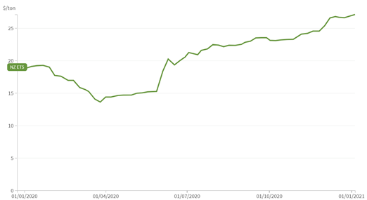 碳價(jià)格方面,新冠肺炎疫情期間,受制于經(jīng)濟(jì)緩滯,新西蘭碳配額價(jià)格從2020年1月的18.83美元降至3月14.35美元,后續(xù)逐步回升至年底的26.78美元。表明市場(chǎng)投資者意識(shí)到隨著碳排放上限的設(shè)定、固定價(jià)格期權(quán)的取消,碳市場(chǎng)需求將會(huì)進(jìn)一步提升。