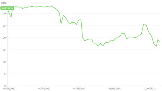 近兩年在韓國(guó)碳市場(chǎng)中,碳價(jià)持續(xù)處于波動(dòng)狀態(tài)。2020年是韓國(guó)碳市場(chǎng)(K-ETS)運(yùn)行第二階段的最后一年,受新冠疫情影響, 2020年的價(jià)格波動(dòng)更加劇烈。碳價(jià)格在2020年4月初達(dá)到頂峰(35.92美元),然后從5月開(kāi)始大幅下降至16.95美元,8月開(kāi)始反彈至12月初達(dá)到25.84美元,12月末又有所回落(19.49美元)。2020年9月,韓國(guó)總統(tǒng)文在寅宣布將在2050年之前實(shí)現(xiàn)凈零排放的長(zhǎng)期目標(biāo),預(yù)計(jì)將在未來(lái)幾年更新氣候政策框架,促進(jìn)對(duì)低碳技術(shù)的投資。
