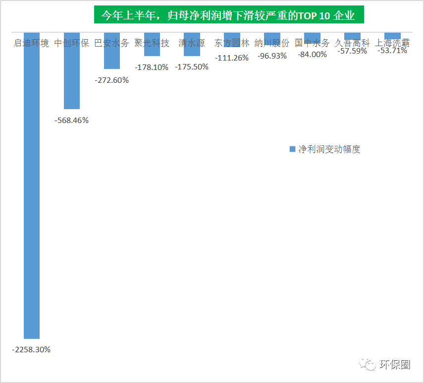 相反,同樣也有表現(xiàn)欠佳,未能在后疫情時(shí)代實(shí)現(xiàn)“業(yè)績翻盤”的營收增幅倒數(shù)TOP10企業(yè),這些企業(yè)有的是已經(jīng)引入國資,但混改成效不大,如雄安入主的科融環(huán)境,中節(jié)能旗下的中環(huán)裝備、節(jié)能鐵漢,濰坊國資接盤的巴安水務(wù);有的是營收和凈利潤財(cái)務(wù)指標(biāo)均下滑的的中創(chuàng)環(huán)保(曾用名三維絲)、惠城環(huán)保、綠茵生態(tài);還有的是營收下滑,凈利潤卻大增300.04%的菲達(dá)環(huán)保。(如圖七所示)圖七:半年度營收下滑較快的TOP10榜單▼
