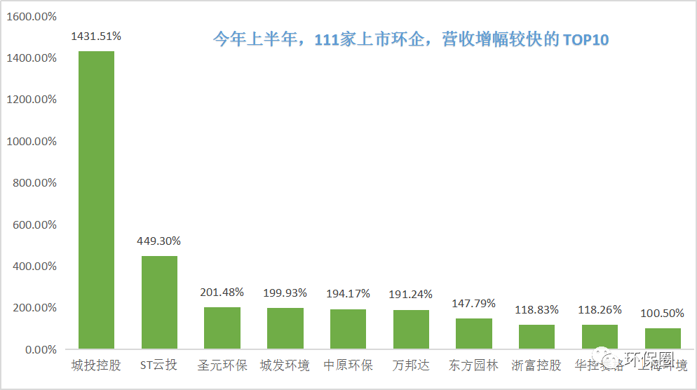 營收變動(dòng)幅度方面,數(shù)據(jù)同樣喜人。111家上市環(huán)企,除了那些穩(wěn)步連續(xù)增長“卓越者”,每年總有一些讓人意想不到的“黑馬”企業(yè)率先突圍出來,少則百分之幾百增長,多則百分之上千增長,成為上半年?duì)I收增速最快的10家先鋒企業(yè)。在半年度營收增速TOP10中,既有坐落于上海的房產(chǎn)/水務(wù)/固廢“三劍齊發(fā)”的城投控股以及旗下的上海環(huán)境,也有因納入電價(jià)補(bǔ)貼、部分焚燒項(xiàng)目轉(zhuǎn)運(yùn)營推動(dòng)業(yè)績大增的城發(fā)環(huán)境和圣元環(huán)保,亦有去年業(yè)績還萎靡不振的萬邦達(dá)和東方園林(如圖六所示)。圖六:半年度營收增速較快的TOP10榜單▼