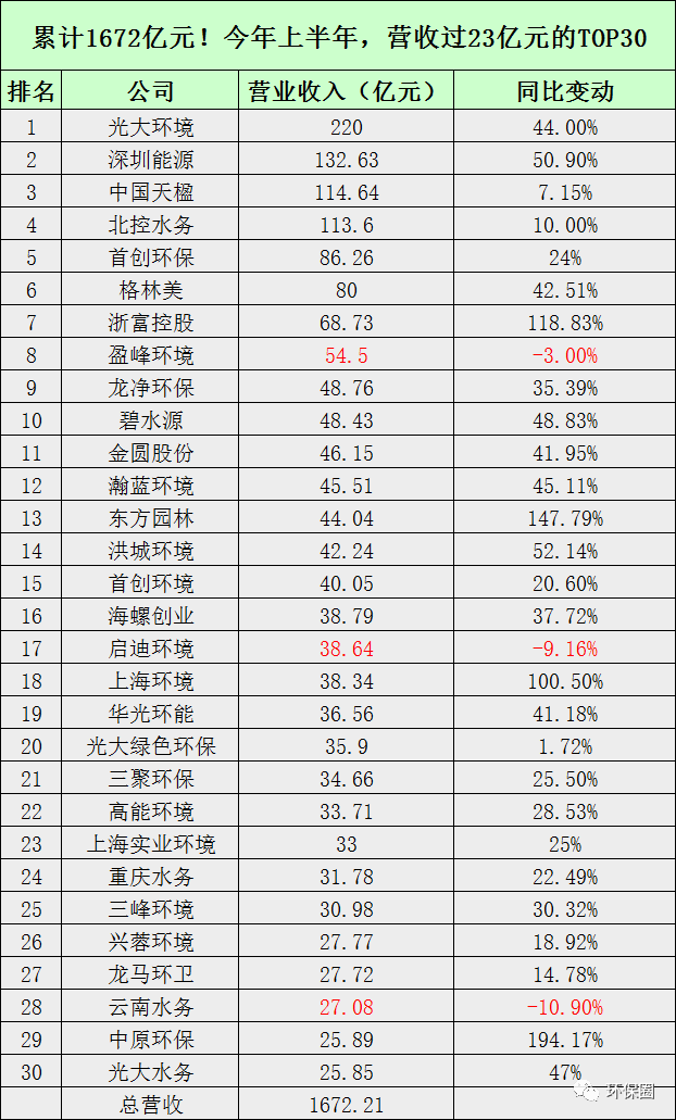 而在半年度營收TOP30榜單中,只有啟迪環(huán)境/盈峰環(huán)境/云南水務(wù)略微下降,其余27家均業(yè)績大喜,30家企業(yè)累計(jì)實(shí)現(xiàn)總營收高達(dá)1672億元,這些企業(yè)也掌握著環(huán)保行業(yè)絕大多數(shù)財(cái)富,算是業(yè)內(nèi)較為優(yōu)秀上市企業(yè)(如圖五所示)。圖五:半年度營收過23億元的TOP30榜單圖▼