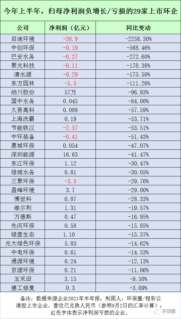也就是說,今年上半年,111家上市環(huán)企中,無論是營業(yè)收入,還是歸母凈利潤方面,大家都表現(xiàn)得不錯(cuò),一掃2020年的悲觀情緒,70%以上的環(huán)保企業(yè)都向股東和市場交付了一張靚麗的答卷,實(shí)現(xiàn)了“后疫情時(shí)代”的強(qiáng)勢反彈。具體到個(gè)股,絕大多數(shù)企業(yè)也都在今年上半年開了個(gè)好頭,經(jīng)營業(yè)績打了個(gè)漂亮“翻身仗”。有的一改往日業(yè)績頹勢,歸母凈利潤實(shí)現(xiàn)百分之幾千增長,如雪浪環(huán)境,城發(fā)環(huán)境、雪迪龍;也有的逐步擺脫虧損帽子,歸母凈利潤實(shí)現(xiàn)百分之幾百的大增,如中金環(huán)境、嶺南股份、蒙草生態(tài)、津膜科技、菲達(dá)環(huán)保等;還有的細(xì)分領(lǐng)域龍頭,如上文提到格林美、碧水源、清新環(huán)境,也從去年疫情和產(chǎn)業(yè)寒冬的陣痛中慢慢地企穩(wěn)、好轉(zhuǎn),重現(xiàn)往日輝煌。歷經(jīng)了金融領(lǐng)域去杠桿、PPP政策強(qiáng)監(jiān)管、新冠肺炎疫情沖擊以及民企易主“混改潮”后,這些上市環(huán)企雖然有過迷茫,有過失敗,有過反思,但最終還是重拾信心,不屈不撓,終于迎來了業(yè)績復(fù)蘇。不過,今年上半年,在業(yè)績普遍好轉(zhuǎn)的背景下,依然還是有個(gè)別環(huán)保企業(yè)“不爭氣”,表現(xiàn)差強(qiáng)人意,比如啟迪環(huán)境、巴安水務(wù)、節(jié)能國禎、聚光科技、中環(huán)裝備等10家企業(yè)(如圖三所示),營收和凈利潤雙雙下滑,甚至有的企業(yè)較上年同期,虧損幅度擴(kuò)大化,前景堪憂。圖三:今年上半年,營收和凈利潤“雙降”的10家上市環(huán)企▼