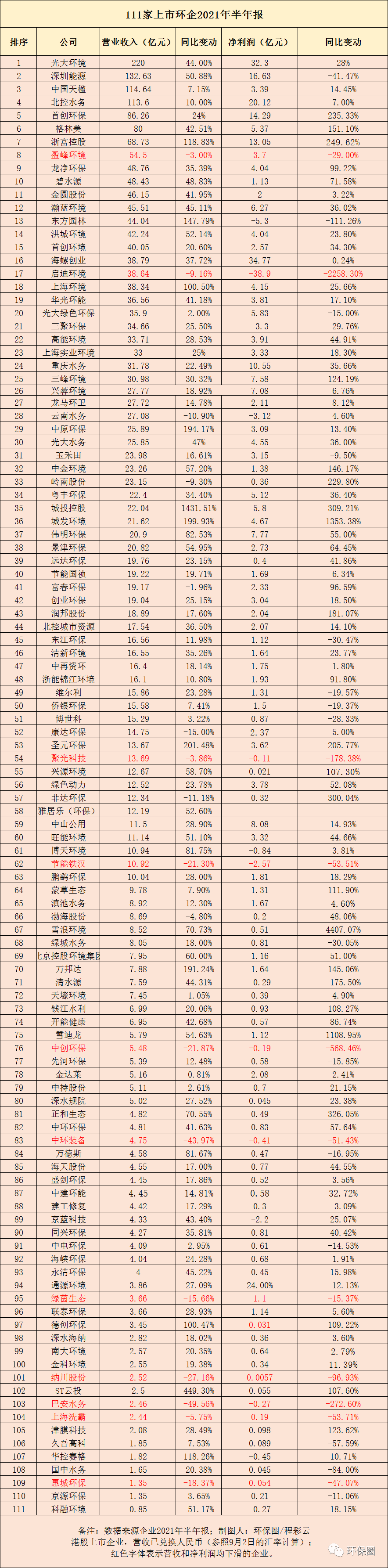 如往常一樣,每年筆者都會(huì)花費(fèi)2周左右時(shí)間統(tǒng)計(jì)制圖,通過營收、營收增幅、凈利潤、凈利潤增幅等幾方面的數(shù)據(jù)維度,為讀者展現(xiàn)每家上市環(huán)企的業(yè)績增長情況,以及頭部企業(yè)的變化,從中窺探整體產(chǎn)業(yè)的發(fā)展?fàn)顩r。還記得去年,在統(tǒng)計(jì)百余家上市環(huán)企2020年業(yè)績時(shí),曾經(jīng)反復(fù)提到到一句話——“疫情影響疊加產(chǎn)業(yè)寒冬余溫,大家普遍過得都不如從前了,別說10%、20%、30%增長,能活下來都不錯(cuò)了?!?/strong>這種“王小二過年,一年不如一年”的形勢,曾經(jīng)導(dǎo)致百余家上市環(huán)企近半數(shù)表現(xiàn)不理想,要么營業(yè)收入負(fù)增長,要么歸母凈利潤下滑或虧損,其中不乏有排名非常靠前的細(xì)分領(lǐng)域龍頭,如北控水務(wù)、格林美、碧水源、啟迪環(huán)境、東江環(huán)保等,好的不好,差的更差。那么今年上半年呢?環(huán)保企業(yè)是繼續(xù)一蹶不振,業(yè)績持續(xù)低迷?還是東山再起,打了漂亮翻身仗?總體來看,今年上半年,111家上市環(huán)保企業(yè)中,營收同比增長的高達(dá)97家,占比87%;歸母凈利潤同比增加則有83家,約占75%;營收和歸母凈利潤“雙增”有75家,約占總數(shù)67%(如圖一圖二所示)。圖一:111家上市環(huán)保企業(yè)2021中報(bào)總體情況▼