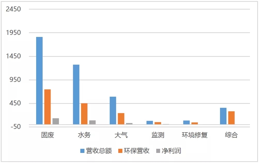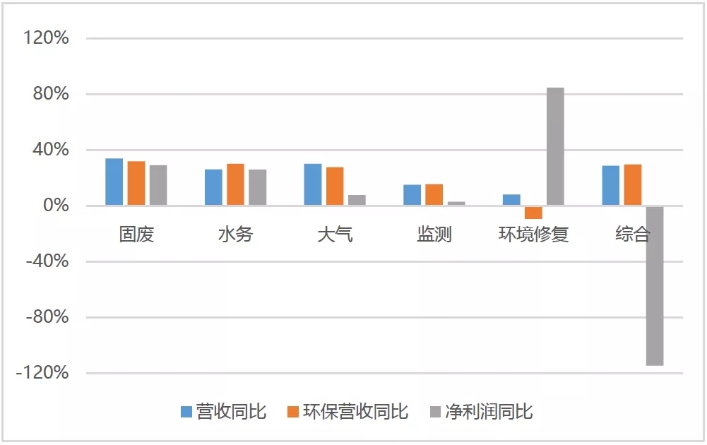 綜合服務(wù)領(lǐng)域,營業(yè)收入同比增長28.94%,環(huán)保營收同比增長29.6%,凈利潤下降113%,個別企業(yè)(如啟迪環(huán)境、東方園林)虧損額度較大。