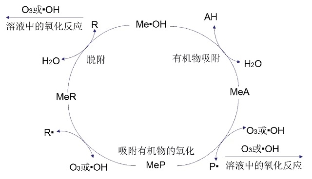 臭氧催化氧化技術(shù)可以解決臭氧氧化過程中臭氧利用效率低、礦化能力低以及污染物分解不徹底等問題。在常溫常壓下,臭氧通過催化劑的作用促進(jìn)分解并產(chǎn)生羥基自由基(·OH),將難以用臭氧單獨氧化或者臭氧氧化分解不徹底的有機(jī)物進(jìn)行分解和礦化。·OH的氧化過程具有無選擇性、反應(yīng)速率高等特點,與大多數(shù)有機(jī)物反應(yīng)時速率常數(shù)通常為106——109 M-1s-1,比臭氧與有機(jī)物的反應(yīng)速率常數(shù)高出7個數(shù)量級。