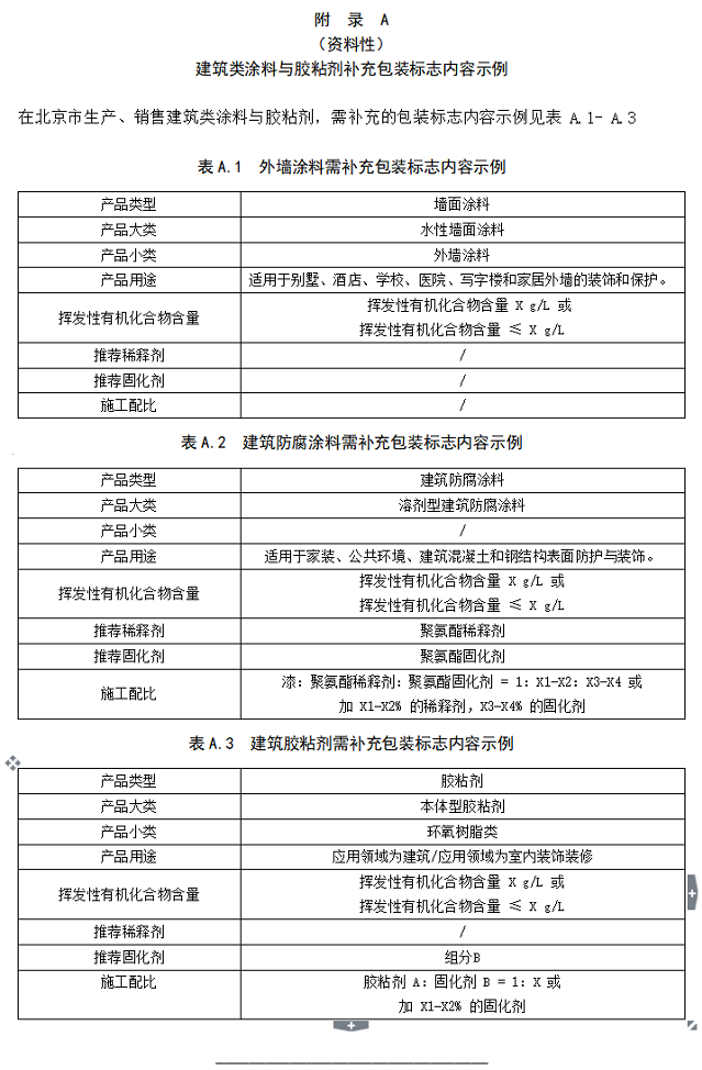 在北京市生產(chǎn)、銷售本文件規(guī)定的產(chǎn)品,除原有產(chǎn)品說(shuō)明外,需要在包裝標(biāo)志上補(bǔ)充標(biāo)明以下內(nèi)容,示例參照附錄 A: