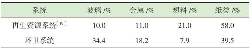 可回收物理論上包括各類可以回收利用的組分,一些組分具有較高的市場售價,往往進入再生資源系統(tǒng)。而另一些組分可以回收但市場價格較低,需要環(huán)衛(wèi)系統(tǒng)進行兜底回收。表 3為進入再生資源系統(tǒng)和環(huán)衛(wèi)系統(tǒng)的玻金塑紙的比例,可以看出環(huán)衛(wèi)系統(tǒng)回收的玻璃等低值可回收物的數(shù)量要明顯高于再生資源系統(tǒng),而紙類和塑料則相反?!皟删W(wǎng)”融合與規(guī)范回收是許多城市垃圾分類工作的重點,一方面推動管理機制融合,另一方面加快回收設施的融合和數(shù)據(jù)的共享。