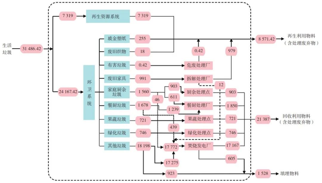 圖2 2018年深圳市生活垃圾分類系統(tǒng)物質(zhì)流示意(單位:t/d)