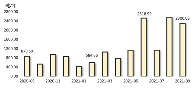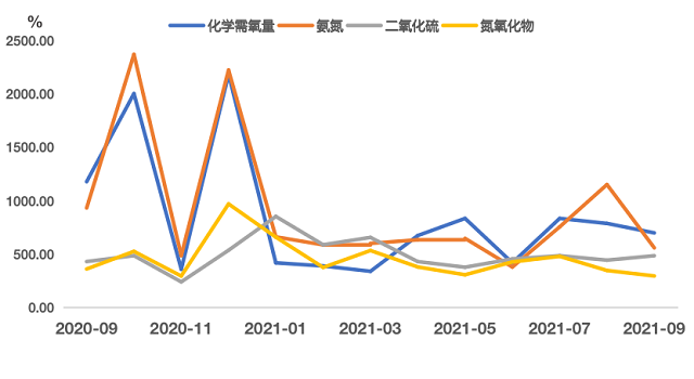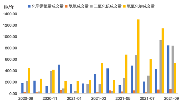 排污權成交量高位堅挺,保持小幅度波動。2021年9月,四項排污權成交量合計為2300.03噸,環(huán)比下跌10.73%,與上年同期相比上升164.22%。