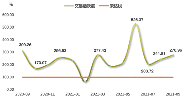 浙江省排污權交易活躍度持續(xù)回暖。由圖可見,交易活躍度指數(shù)在7月沖高回落后,8至9月期間交易度連續(xù)恢復性回暖,2021年9月指數(shù)值收報于276.96點,環(huán)比上漲14.54%,與上年同期相比下行10.45%。