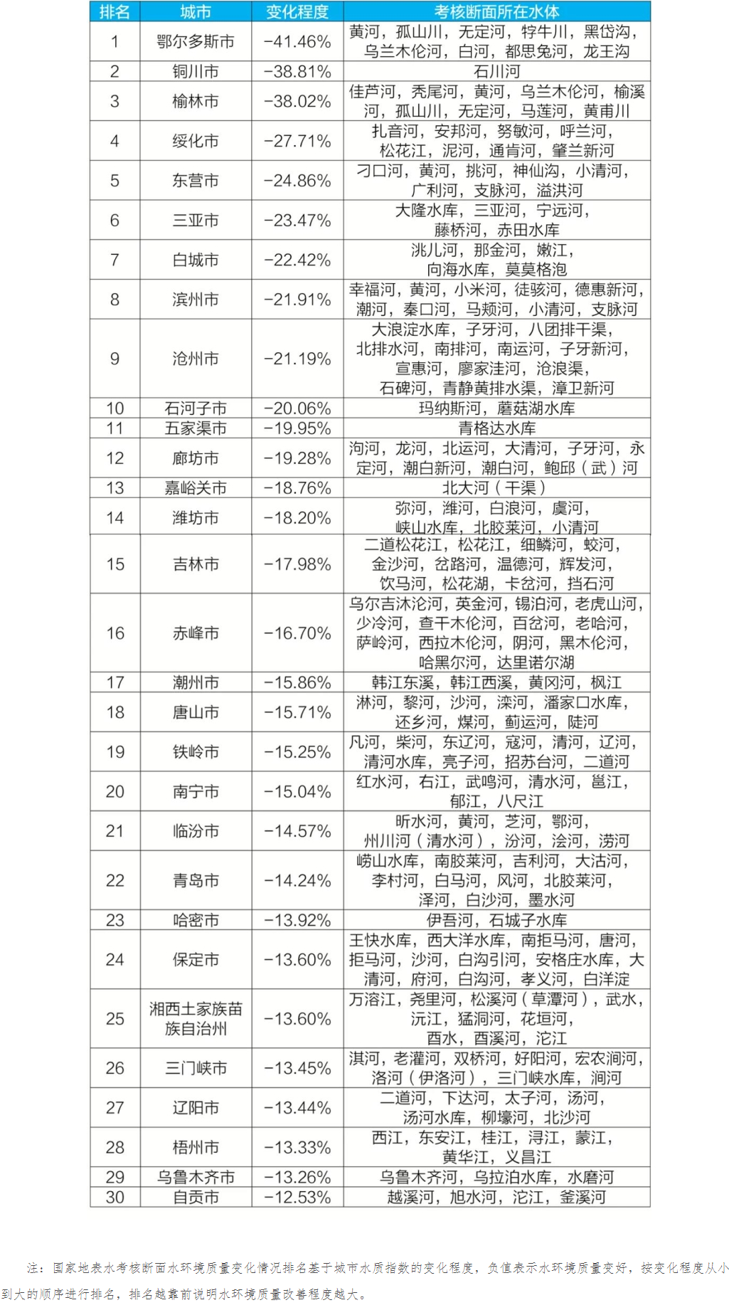 1-9月國(guó)家地表水考核斷面水環(huán)境質(zhì)量變化情況排名前30位城市及所在水體