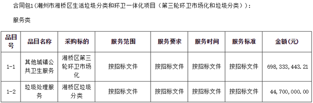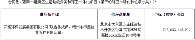 近日,中國固廢網(wǎng)從E20環(huán)境平臺標訊采集系統(tǒng)E標通獲悉,廣東省潮州市湘橋區(qū)生活垃圾分類和環(huán)衛(wèi)一體化項目(第三輪環(huán)衛(wèi)市場化和垃圾分類)、潮州市楓溪區(qū)生活垃圾分類和環(huán)衛(wèi)一體化項目(第三輪環(huán)衛(wèi)市場化和垃圾分類)相繼發(fā)布中標公告,深能環(huán)保聯(lián)合體中標湘橋區(qū)項目,中標金額約7.43億元,服務期限5年;除此之外,深能環(huán)保又單獨斬獲楓溪區(qū)項目,中標金額約2.51億元,服務期限5年。