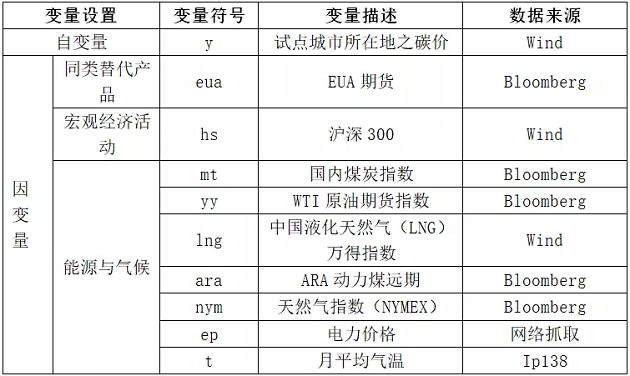 回顧上述文獻(xiàn)可以發(fā)現(xiàn),多數(shù)國內(nèi)外學(xué)者的研究證實(shí)了同類替代品、宏觀經(jīng)濟(jì)活動(dòng)、能源與氣候變化會對碳價(jià)有較為顯著的影響。為了進(jìn)一步探究這一系列影響因素對碳價(jià)的共同影響,并比較其相關(guān)性,本文將在這三個(gè)層面選取部分代表性指標(biāo),并將其聯(lián)立以分析影響結(jié)果。