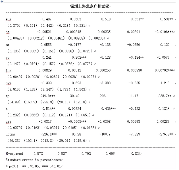 在篩選掉缺失數(shù)據(jù)并統(tǒng)一時(shí)間與貨幣單位后,本文最終對深圳、上海、北京、廣東、以及湖北在2017年1月至2021年1月這四年間的日度數(shù)據(jù)進(jìn)行回歸。研究發(fā)現(xiàn),五次回歸模型在F檢驗(yàn)中的P值均<0.01,可見此模型均在0.01水平上是有效的。其次,深圳、上海、北京、廣東、以及湖北在以一系列應(yīng)變量的回歸模型中R方分別為0.5730、0.5871、0.7920、0.6952、0.8243,盡管相對于宏觀層面R方的大小并不是很大,但具有一定的解釋意義。