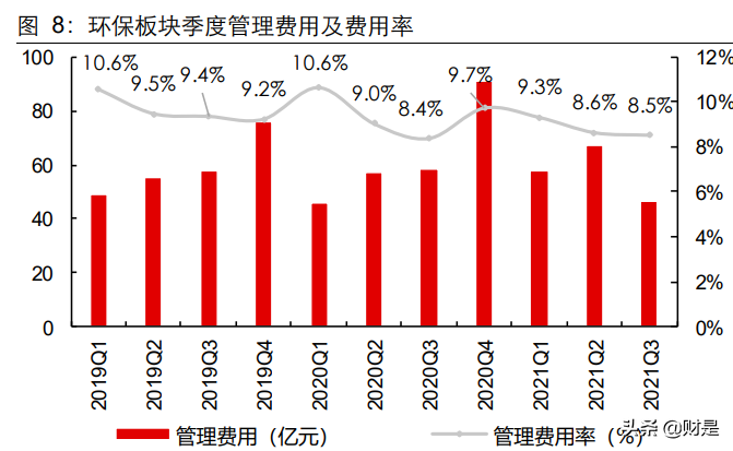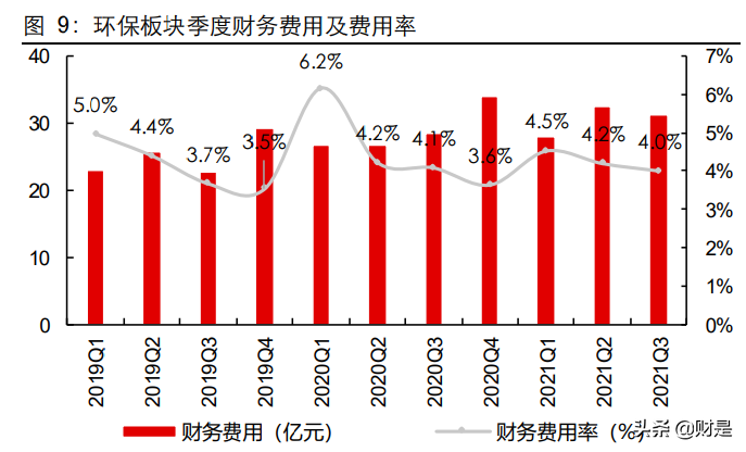 費用端得到控制:2021Q1-Q3環(huán)保板塊期間費用累計支出為361.8億元,同比增14.6%, 期間費用率同比降1.2pct至15.7%。費用率方面,銷售費用率 2.8%,同比降0.41pct;管理費用(含研發(fā)費用,下同)率8.8%,同比降 0.37pct;財務(wù)費用率4.1%,同比降0.41pct。期間費用率同比下行的主要原因是:疫情后,收入同比大幅增長23.3%,致期間費用率顯著下行。2021Q1-Q3期間費用增速分別為:檢測同比增31.3%,期間費用率同比降 1.1pct至33.6%;水務(wù)運營同比增20.4%,期間費用率同比降1.1pct至14.7%;監(jiān)測同比增17.8%,期間費用率同比增4.8pct至42.5%;固廢同比增15.0%,期間費用率同比降0.55pct至11.8%;大氣同比增10.3%,期間費用率同比降 0.88pct至14.4%;水(工程設(shè)備)同比增9.6%,期間費用率同比降 4.0pct 至 20.5%;節(jié)能同比增2.4%,期間費用率同比降2.2pct 至 13.8%。