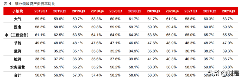 資產(chǎn)負(fù)債表:負(fù)債率同比增 0.95pct,應(yīng)收賬款控制較好剔除近期數(shù)據(jù)不全的標(biāo)的,2021Q3環(huán)保板塊資產(chǎn)負(fù)債率攀升至59.3%,同比提升0.9pct, 環(huán)比提升0.02pct,負(fù)債率持續(xù)上行,同比上行較快的板塊為監(jiān)測、大氣、水(工程設(shè)備),分別上行3.5pct/2.0pct/1.8pct,至 39.3%/63.7%/65.5%,環(huán)比提升較快的板塊為大氣、監(jiān)測、檢測,分別上行 3.4pct/1.1pct/1.0pct。檢測方向國檢集團(tuán)處于資本開支期,負(fù)債率持續(xù)快速提升,環(huán)比增5.7pct至40.2%。固廢方向資產(chǎn)負(fù)債率表觀上同比降 0.39pct 至 59.6%,惠城環(huán)保發(fā)行轉(zhuǎn)債負(fù)債率提升11.4pct 至 52.2%;垃圾焚燒相關(guān)標(biāo)的Q3負(fù)債率較為穩(wěn)定;盈峰環(huán)境應(yīng)付票據(jù) 到期兌付,負(fù)債率下行 3.1pct。大氣主要是清新環(huán)境負(fù)債率環(huán)比提升 17.1pct 至 66.6%;監(jiān)測為天瑞儀器、皖儀科技分別環(huán)比提升6.6pct/4.8pct。