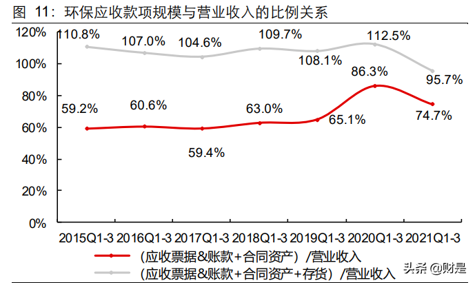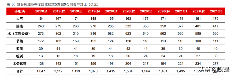 考慮到當(dāng)下部分公司將實質(zhì)的應(yīng)收賬款名義上放至存貨科目名下,故我們考慮存貨后, 2021Q3 末應(yīng)收賬款&票據(jù)+存貨+合同資產(chǎn)同比增 4.9%,(應(yīng)收賬款&票據(jù)+存貨+合同 資產(chǎn))/營業(yè)收入同比降16.8pct,變動原因:1)水(工程設(shè)備)、節(jié)能、大氣的(應(yīng)收賬款&票據(jù)+存貨+合同資產(chǎn))絕對值有所下降,分別降 6.6%、6.4%、1.6%,強(qiáng)化了回款;2)各子行業(yè) 2021Q1-Q3 均獲得營收正增長,行業(yè)整體同比增 23.3%,特別是檢 測、水(工程設(shè)備)的同比增速在 30%以上。