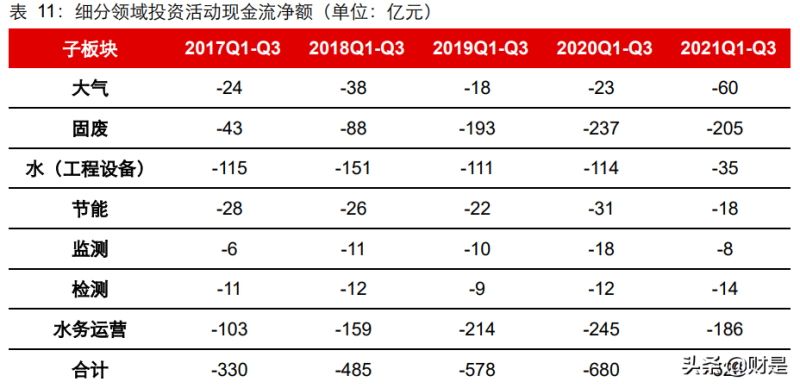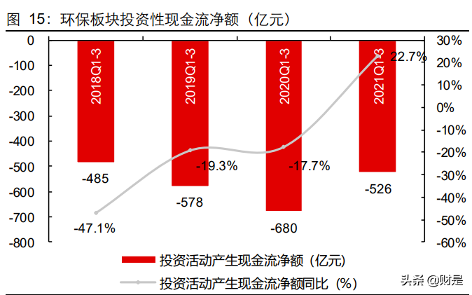 水務(wù)出現(xiàn)下行,主要是首創(chuàng)環(huán)保/中原環(huán)保/聯(lián)泰環(huán)保因業(yè)務(wù)需要,備貨增加,經(jīng)營活動現(xiàn)金流出同比增加20.6/19.7/5.7億元,造成下行。2021Q1-Q3環(huán)保板塊投資活動凈支出同比降 23%達(dá) 526 億元,主要是水(工程設(shè)備)方向的投資性凈支出大幅下降,2021Q1-Q3 的支出為 35 億元,遠(yuǎn)低于2020Q1-Q3 的 114 億元;而固廢、水務(wù)運營板塊的投資活動現(xiàn)金流凈支出分別達(dá)205/186億元,同比存在一定程度下降,但仍保持了相當(dāng)規(guī)模,與該兩個方向仍處于成長期有關(guān),預(yù)計資本開支的需求將維持;投資活動現(xiàn)金流也反映了資金投向的項目整體質(zhì)量有所提升。