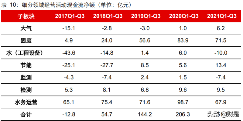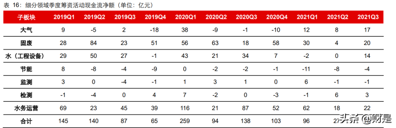 現(xiàn)金流量表:收入快速增長致收現(xiàn)比下行,投融資數(shù)據(jù)環(huán)比回暖2021Q1-Q3 環(huán)保板塊銷售商品收到現(xiàn)金/營收比率(收現(xiàn)比)為 87.7%,同比降 7.2pct,處于歷史數(shù)據(jù)區(qū)間內(nèi);經(jīng)營活動、投資活動及籌資活動產(chǎn)生的現(xiàn)金流量凈額分別 151 億 元(去年同期為 206 億元,同比降 27%)、-526 億元(去年同期為-680億元,凈支出同 比減少 23%)和 197 億元(去年同期為 540 億元,同比降 64%)。收入快速上行致收現(xiàn)比下降,并非回款惡化。環(huán)保行業(yè)收入存在收款周期,而收入的快速上行致當(dāng)期收現(xiàn)比下降,并非行業(yè)回款惡化。行業(yè)經(jīng)歷過2018年 PPP 現(xiàn)金流風(fēng)險后,各公司重視回款,推動 PPP 項目轉(zhuǎn)EPC模式,工程、設(shè)備銷售等業(yè)務(wù)控制客戶質(zhì)量,并強(qiáng)化前期應(yīng)收賬款回款等,使得行業(yè)現(xiàn)金流好轉(zhuǎn),結(jié)合前文對應(yīng)收賬款的討論,也可證明回款在向好。