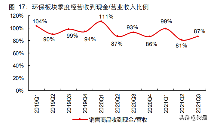 2021Q1-Q3環(huán)保板塊籌資活動現(xiàn)金流凈額為197億元,同比降 64%,行業(yè)融資帶有階段性,2020 年同期籌資活動現(xiàn)金流凈額為 540 億元,同比增 163 億元,故推測為2021年籌資活動相對較弱的主要原因。而水(工程設(shè)備)方向的融資規(guī)模持續(xù)受控,同比減少90億元。2021Q3環(huán)保板塊銷售商品等收到現(xiàn)金/營收比率為86.7%,環(huán)比增5.6pct,同比降 6.7pct, 主要原因為2021Q3收入同比增11.6%,而收入本身存在賬期,故造成收現(xiàn)比同比下行;環(huán)比在收入基本相當(dāng)?shù)那闆r下,實現(xiàn)改善,說明回款良好。