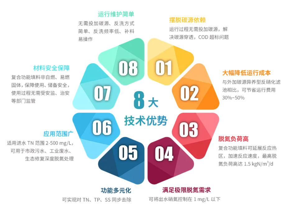 而通過對復(fù)合活性生物載體中硫、鐵及其他活性組分進行優(yōu)化設(shè)計,則能促使附著其上的功能微生物形成代謝偶聯(lián)網(wǎng)絡(luò),實現(xiàn)高生物持有量、長距離電子傳遞,進而獲得高負荷脫氮能力,徹底擺脫對碳的依賴。▼SADeN®技術(shù)8大核心優(yōu)勢