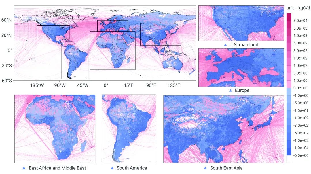 近實(shí)時(shí)全球碳地圖反映出人類(lèi)活動(dòng)變化導(dǎo)致的碳排放時(shí)空動(dòng)態(tài)變化特征,包括氣候、季節(jié)、節(jié)假日甚至是新冠疫情對(duì)碳排放的實(shí)時(shí)動(dòng)態(tài)變化。