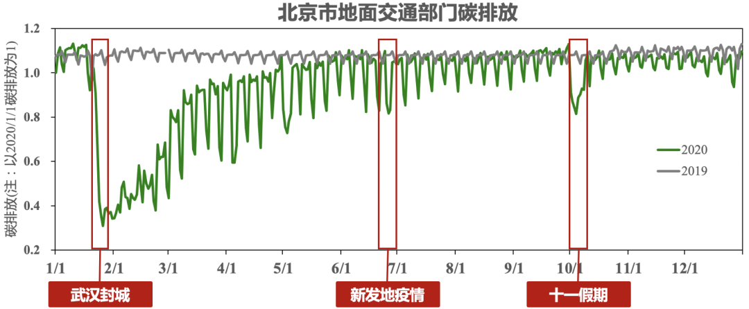 GRACED可精準(zhǔn)捕捉城市等精細(xì)空間尺度下,碳排放受疫情、節(jié)假日等影響的分部門(mén)動(dòng)態(tài)變化。以北京為例,GRACED精準(zhǔn)捕捉到北京市地面交通部門(mén)在2020年1月底受疫情影響的碳排放下降顯著;2020年6月底,因北京新發(fā)地疫情的爆發(fā)碳排放也有所下降;2020年10月初,因十一假期北京市市民外出旅游,市內(nèi)交通碳排放量出現(xiàn)明顯下降(圖8)。
