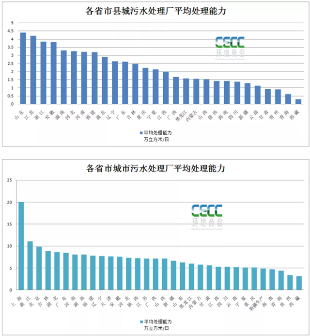 上一篇中提到的城市污水廠平均污水處理能力來看,除開上海的平均污水處理能力達(dá)20萬噸/日外,浙江省城市污水廠平均處理能力達(dá)11萬噸/日,吉林、湖北、廣東、河南、湖南等省市城市污水廠平均處理能力排在靠前的位置,大約在8萬噸/日??梢钥吹剑憬≡诔鞘泻涂h城的污水廠平均處理能力都排在前列,可見污水廠單體規(guī)模相對較大。山東、江蘇、安徽縣城污水處理廠平均處理能力較大,而城市污水處理廠則處在全國的中等水平。