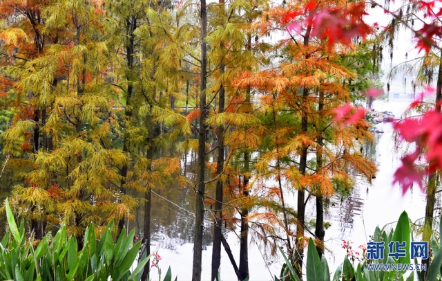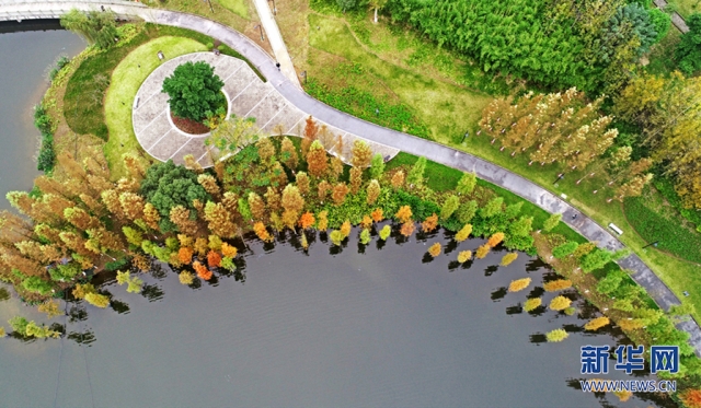 近日,重慶涪陵銅鼓湖公園披上多彩冬裝,紅、橙、黃、綠的植被繽紛交錯,微風吹過,樹影倒映湖面,蕩起層層漣漪。新華網(wǎng)發(fā)(黃河 攝)