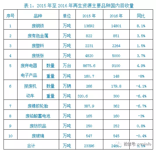 1、回收量。在宏觀經(jīng)濟(jì)形勢總體下行的背景下,再生資源回收行業(yè)總體規(guī)模不但沒有出現(xiàn)大幅下滑,而且有了一定幅度的增長。據(jù)中再生協(xié)會統(tǒng)計(jì)顯示,2016年,廢鋼、廢有色金屬、廢塑料、廢紙、廢棄電器電子產(chǎn)品、報(bào)廢汽車、廢橡膠輪胎、廢鉛酸蓄電池、廢紡織品、廢玻璃等10個(gè)主要品種國內(nèi)回收量2.47億噸(見表1),比2015年同比增長5.5%。