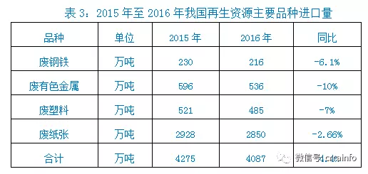 3、進(jìn)口量。2016年,我國廢鋼鐵、廢有色金屬、廢塑料、廢紙4個(gè)品種的進(jìn)口量達(dá)4087萬噸,比2015年同比下降4.4%(見表3)。進(jìn)口量同比下降的原因,是環(huán)保監(jiān)管趨嚴(yán),國家收緊固廢進(jìn)口政策。