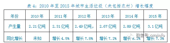 4、近五年全國城市生活垃圾增長幅度。中再生協(xié)會專家組通過實(shí)地調(diào)研及查閱相關(guān)部門資料發(fā)現(xiàn),2010年,全國城市生活垃圾產(chǎn)生量2.21億噸,到2015年,全國城市生活垃圾產(chǎn)生量增長到3.1億噸,5年間城市生活垃圾平均年增長7.54%,其中2014年比2013年同比增長8.2%(見表4)。