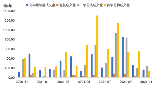 排污權(quán)成交量持續(xù)收窄,指標(biāo)延續(xù)下行走勢(shì)。2021年11月,四項(xiàng)排污權(quán)成交量合計(jì)為559.45噸,環(huán)比下跌47.52%,與上年同期相比下降40.82%。
