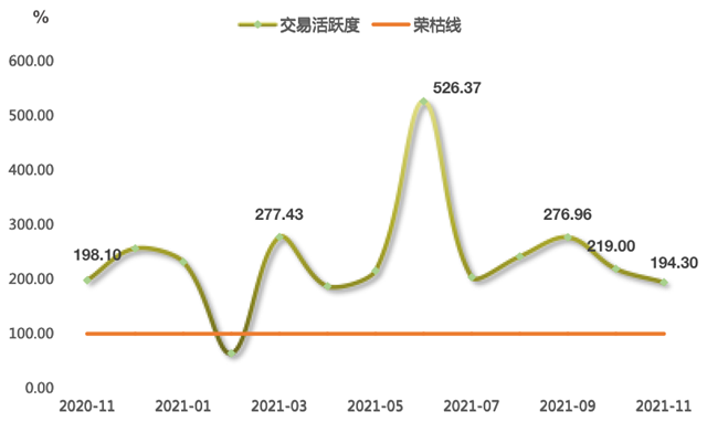 浙江省排污權(quán)交易活躍度盤整下降,降幅收窄。由圖可見,交易活躍度指數(shù)延續(xù)上月兩月下行走勢(shì)后,2021年11月指數(shù)值收?qǐng)?bào)于194.30點(diǎn),環(huán)比下降11.28%,與上年同期相比微跌1.92%。