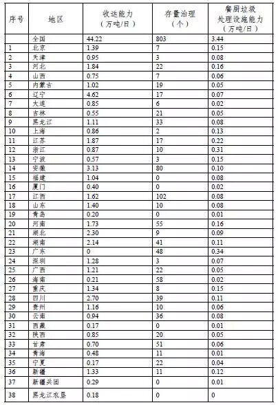 新增餐廚垃圾處理能力3.44萬噸/日。